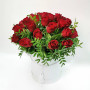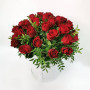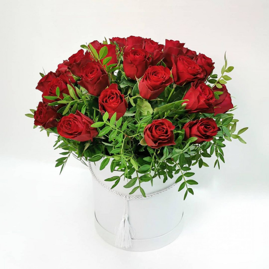 Букет из 41 великолепной красной розы в белой шляпной коробке с добавлением веток писташа – это настоящий шедевр цветочного искусства. Этот букет не оставит равнодушным никого, кто его увидит. Красные розы символизируют любовь и страсть, а белые писташи добавляют свежести и легкости. Такой букет станет прекрасным подарком на любое торжество или просто без повода. Он будет долго радовать своей красотой и ароматом, напоминая о вашем внимании и заботе.