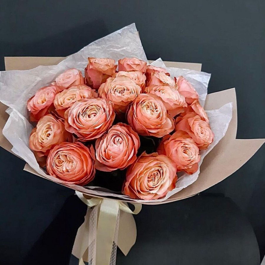 На фото букет из 19 оранжевых пионовидных роз. В составе: пионовидная роза 19 шт, крафт-бумага 1 шт, . Все цветы свежие и ароматные, букет красиво оформлен и отлично подходит для подарка. Доступна доставка цветов или самовывоз.