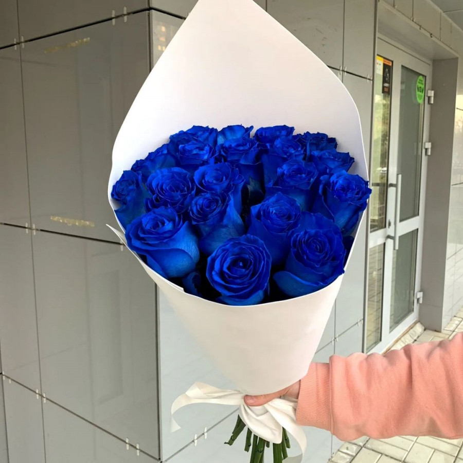 На фото букет из 19 синих роз. В составе: роза (синяя) 19 шт, крафт-бумага 1 шт, атласная лента 1 шт, . Все цветы свежие и ароматные, букет красиво оформлен и отлично подходит для подарка. Доступна доставка цветов или самовывоз.