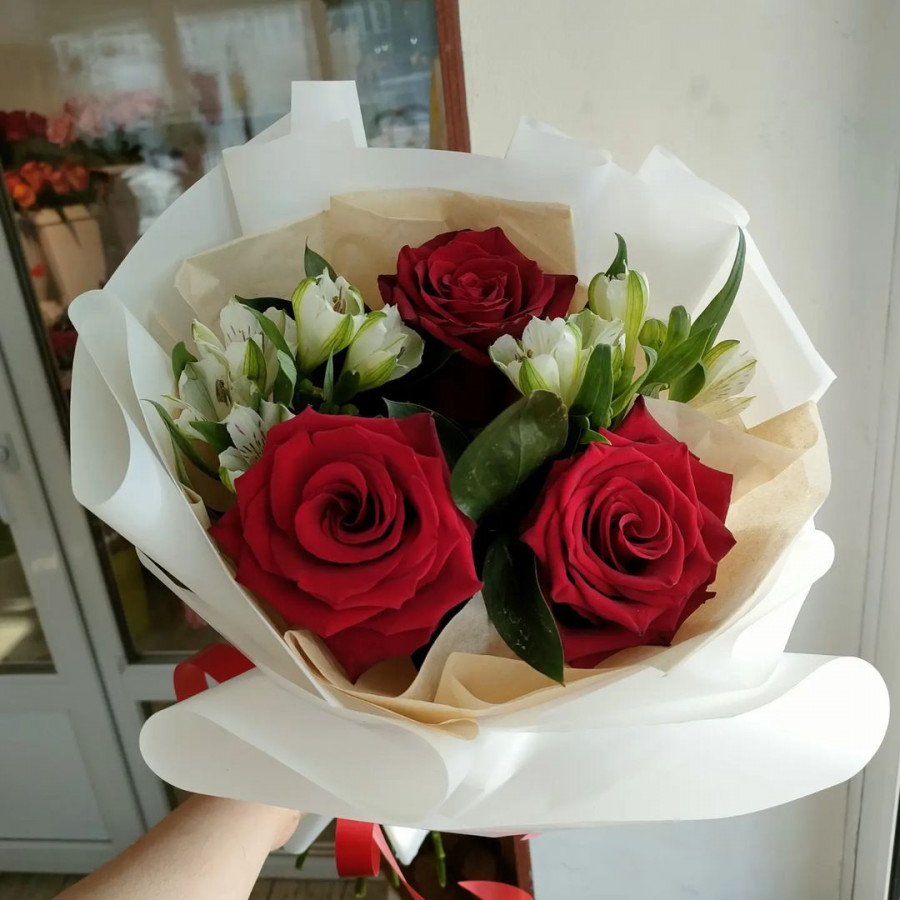Букет из 3 красных роз с альстомерией в Новочебоксарске