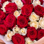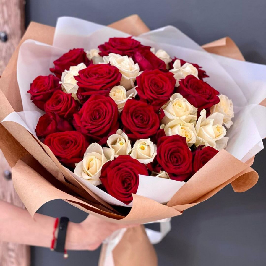 На фото букет из 33 белых и красных роз. В составе: роза 33 шт, крафт-бумага 1 шт, атласная лента 1 шт, . Все цветы свежие и ароматные, букет красиво оформлен и отлично подходит для подарка. Доступна доставка цветов или самовывоз.