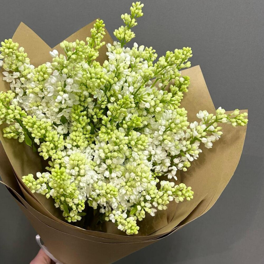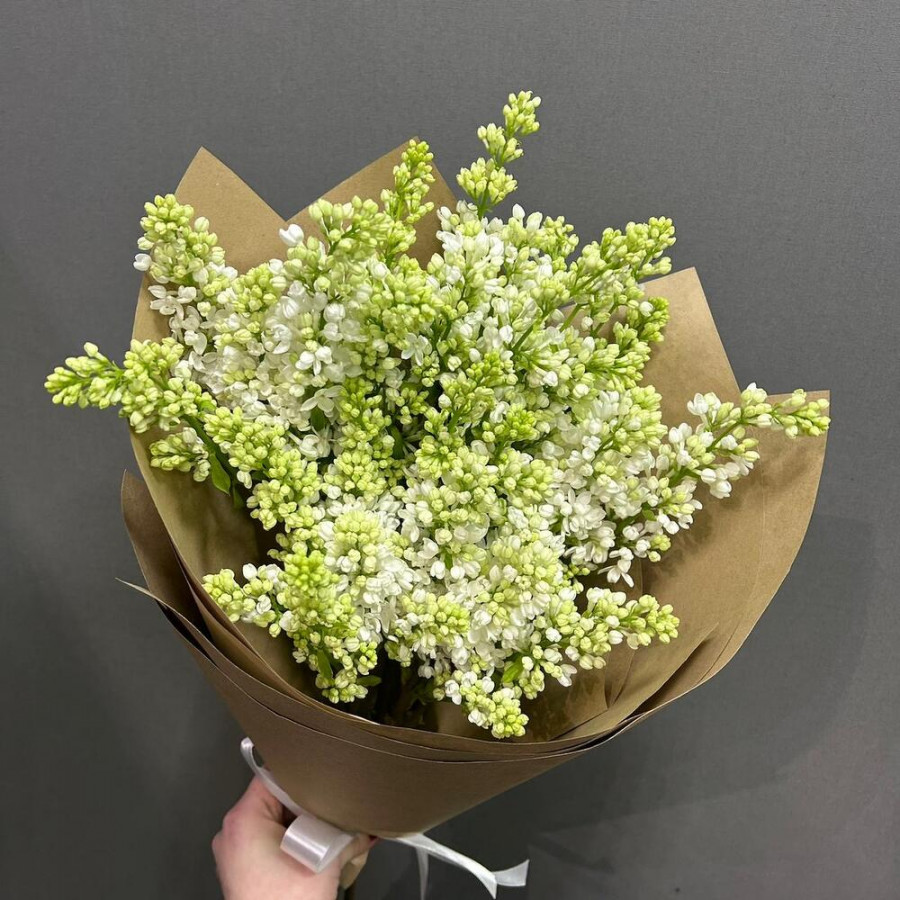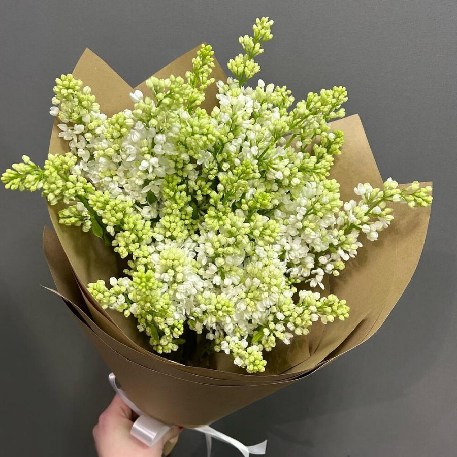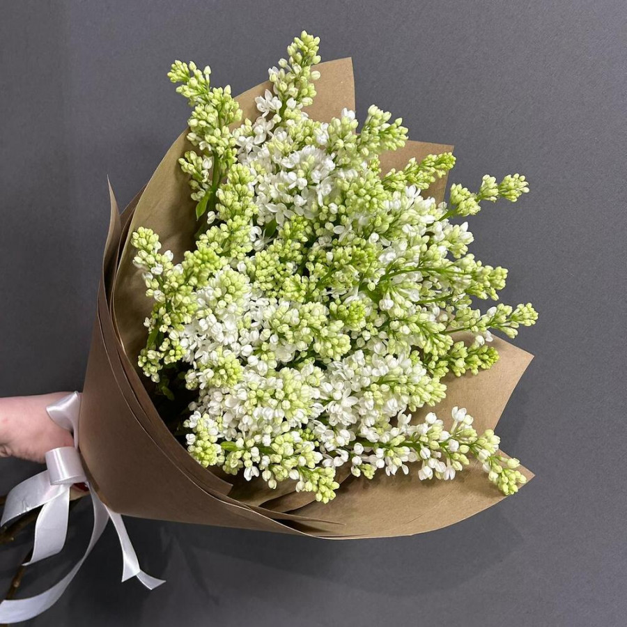 На фото букет из 5 шикарных веток белой сирени. В составе: сирень 5 шт, крафт-бумага 2 шт, атласная лента 1 шт, . Все цветы свежие и ароматные, букет красиво оформлен и отлично подходит для подарка. Доступна доставка цветов или самовывоз.