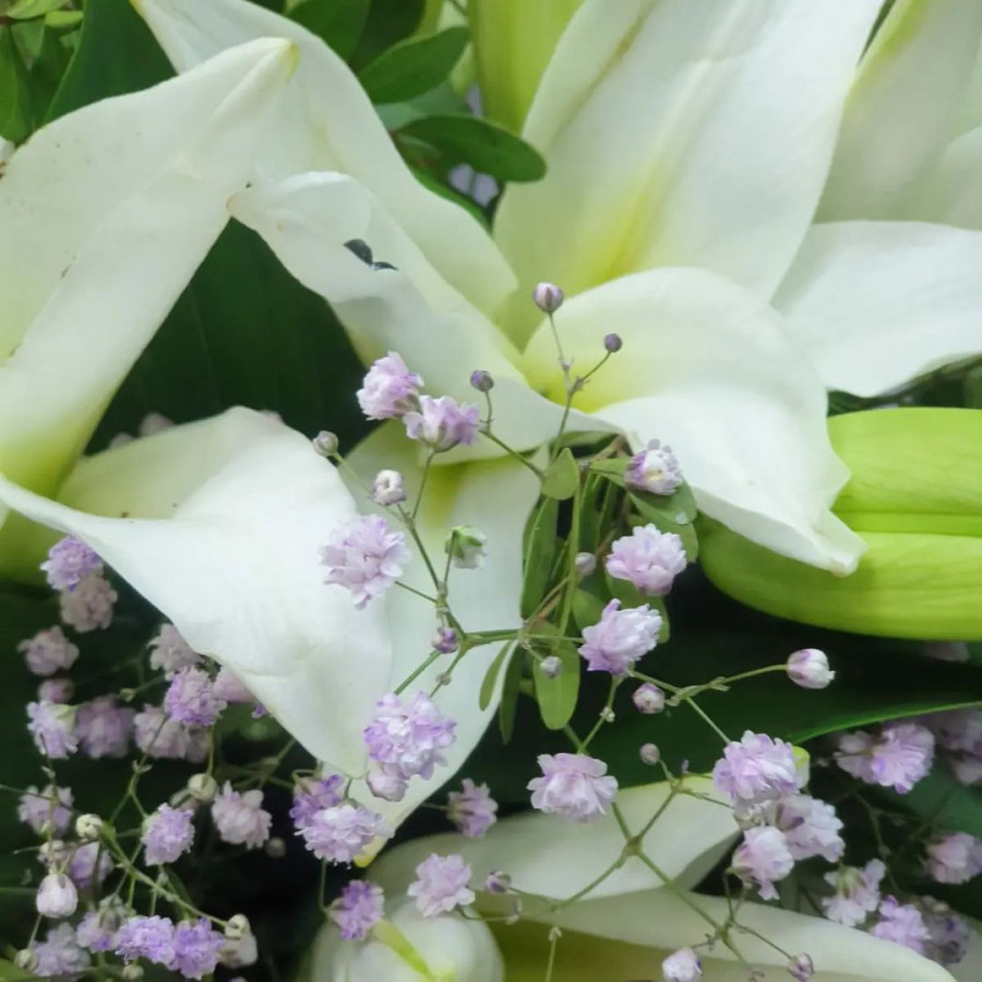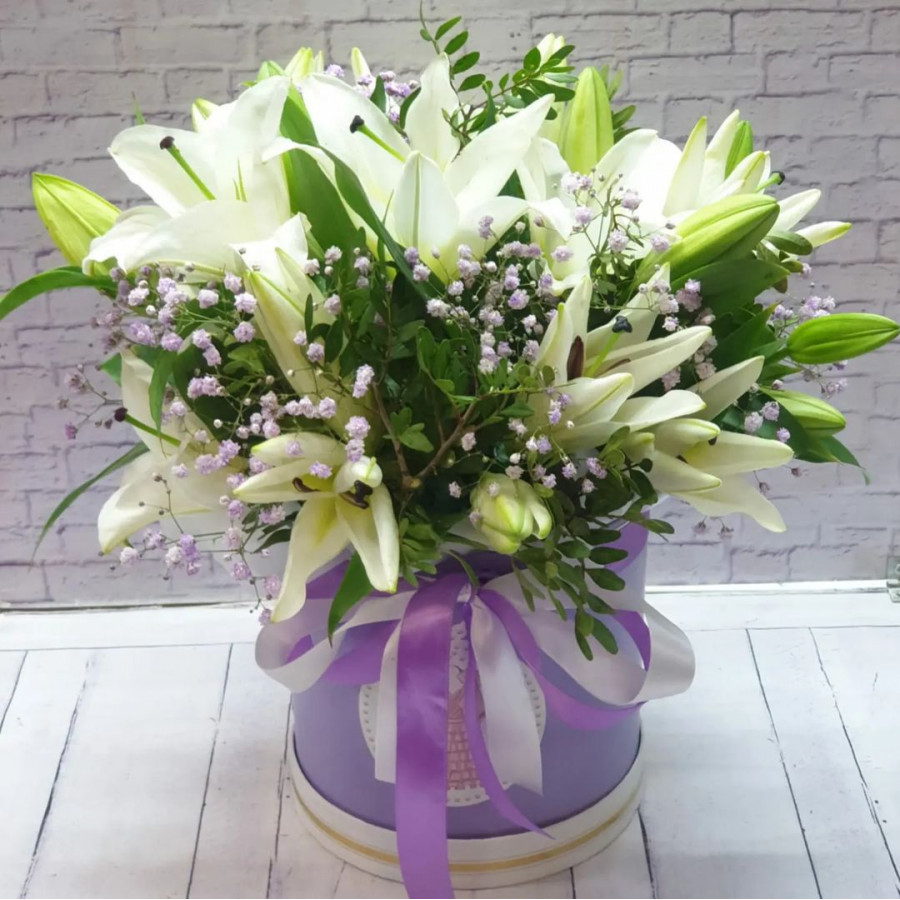 На фото букет из лилий и гипсофилы в коробке. В составе: лилия 7 шт, гипсофила 5 шт, шляпная коробка (m) 1 шт, атласная лента 1 шт, . Все цветы свежие и ароматные, букет красиво оформлен и отлично подходит для подарка. Доступна доставка цветов или самовывоз.