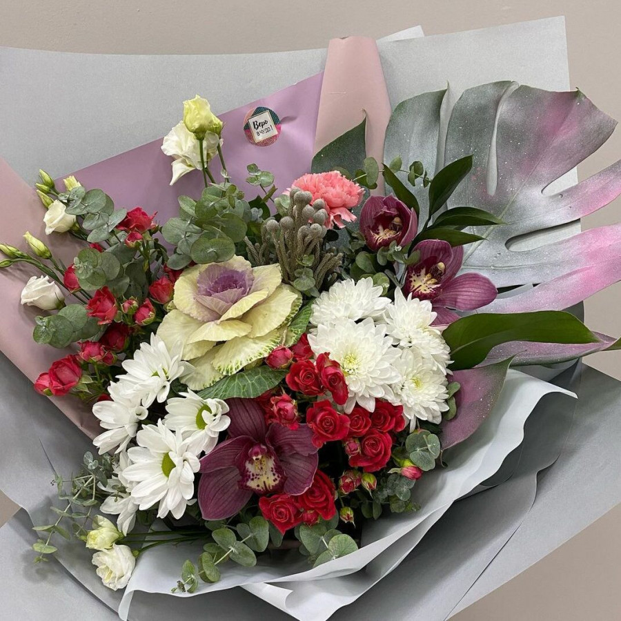 На фото гигантский букет с монстерой. В составе: монстера 1 шт, капуста декоративная 1 шт, хризантема кустовая 2 шт, кустовая роза 2 шт, гвоздика 2 шт, орхидея 3 шт, эустома (лизиантус) 1 шт, роза 2 шт, бруния 1 шт, эвкалипт 2 шт, . Все цветы свежие и ароматные, букет красиво оформлен и отлично подходит для подарка. Доступна доставка цветов или самовывоз.