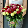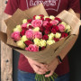 На фото кенийские розы микс. В составе: роза (кения) 45 шт, крафт-бумага 1 шт, атласная лента 1 шт, . Все цветы свежие и ароматные, букет красиво оформлен и отлично подходит для подарка. Доступна доставка цветов или самовывоз.