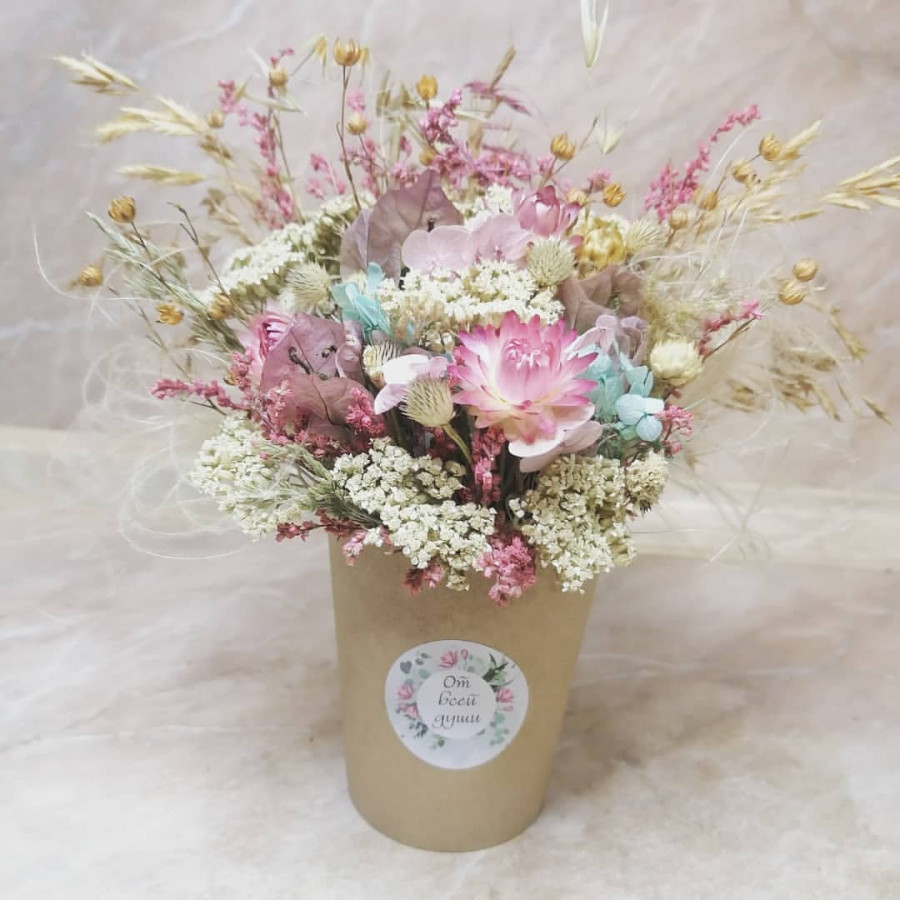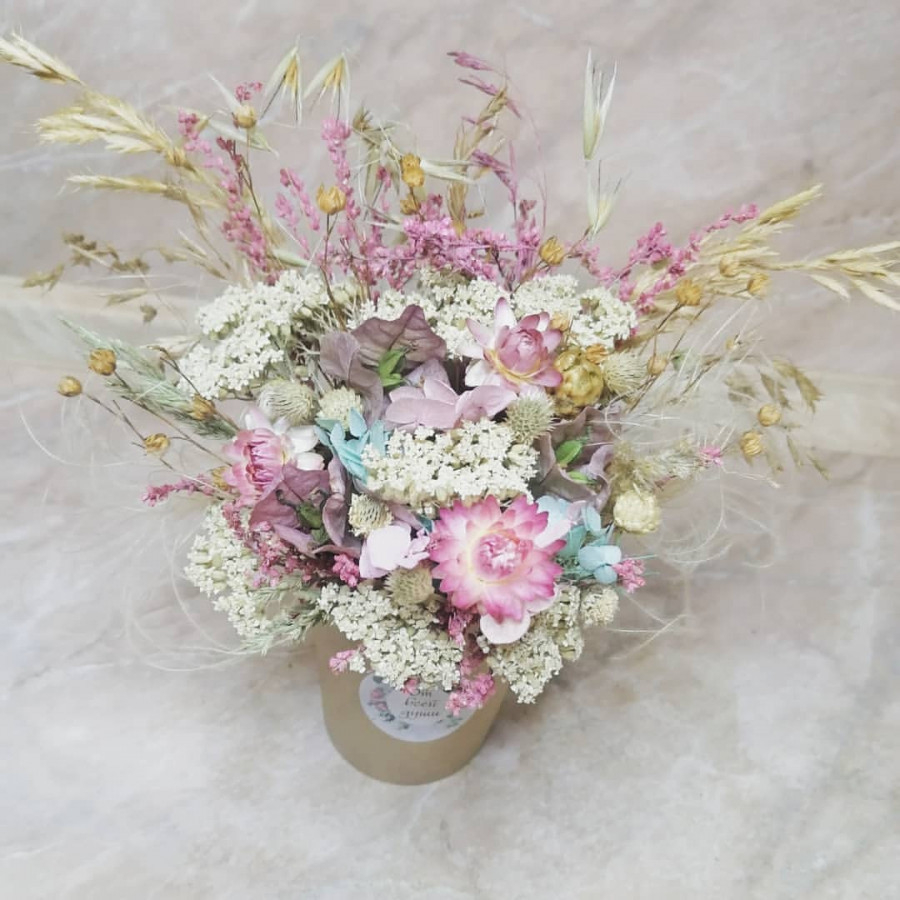 На фото композиция из сухоцветов в коробке. В составе: сухоцветы (микс) 5 шт, коробка (s) 1 шт, . Все цветы свежие и ароматные, букет красиво оформлен и отлично подходит для подарка. Доступна доставка цветов или самовывоз.