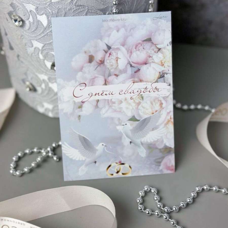 На фото открытка «с днем свадьбы». В составе: . Все цветы свежие и ароматные, букет красиво оформлен и отлично подходит для подарка. Доступна доставка цветов или самовывоз.